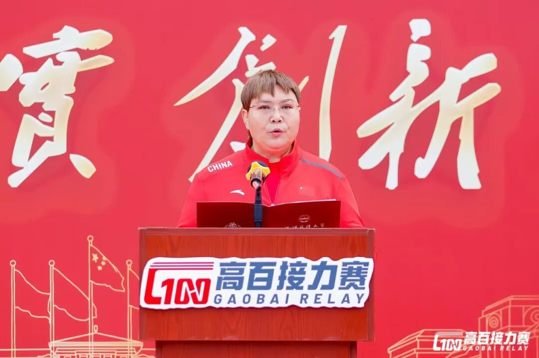 杨海在讲话中提到,高百接力赛是用体育赛事激发学生的团队意识和拼搏精神的生动体现,作为教育强省建设的重要举措,辽宁省始终秉持 “健康第一” 的教育理念,将体育育人贯穿教育全过程,希望运动员们能在竞技中学会尊重对手、超越自我,在拼搏中展现当代大学生团结协作、自强不息的风采。