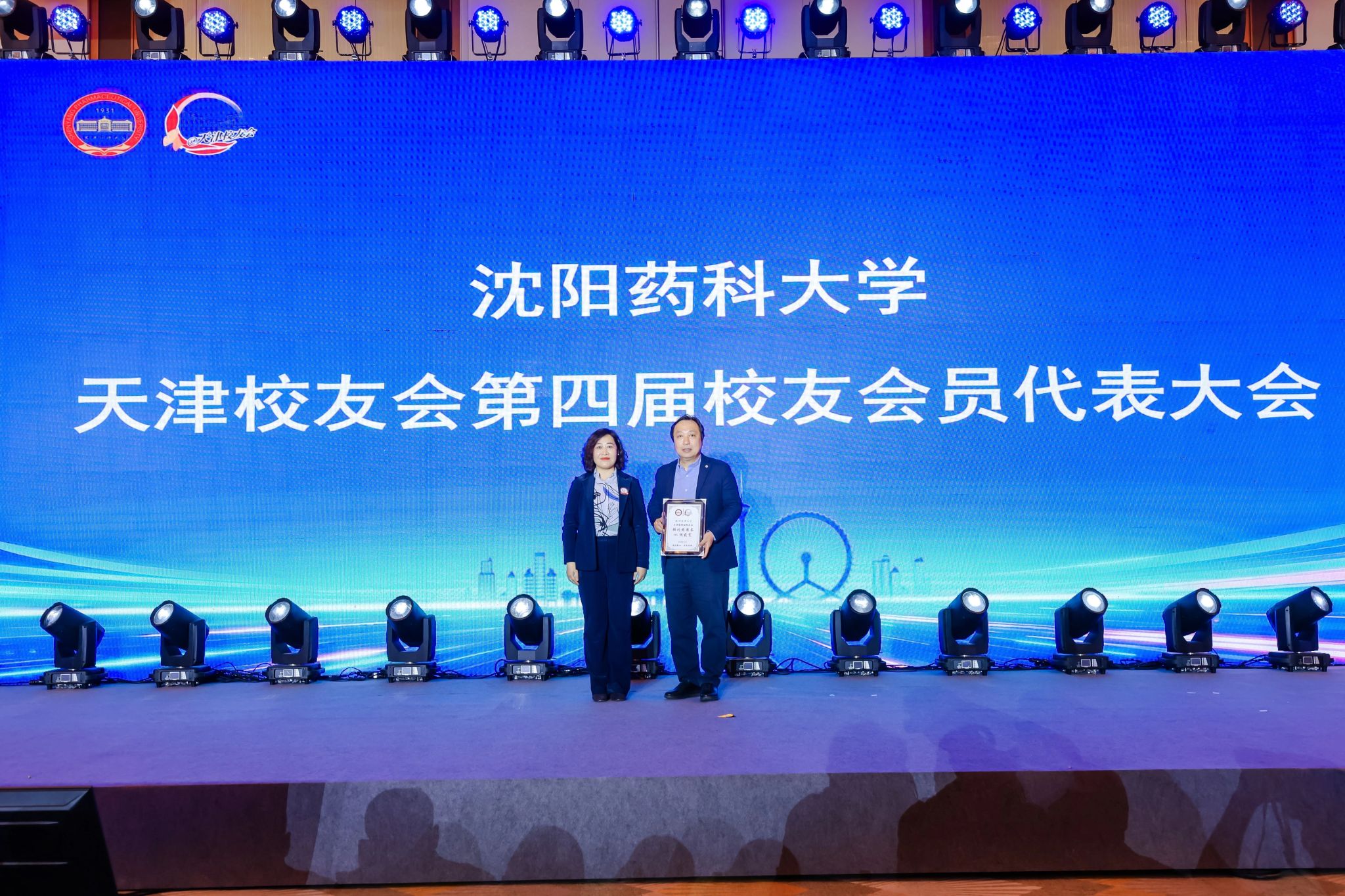 翟鑫代表学校宣读《关于聘任周鸿同志为沈阳药科大学天津校友会会长的决定》,希望天津校友会以此次换届为契机,进一步团结凝聚广大在津校友,推动母校与校友事业协同发展。