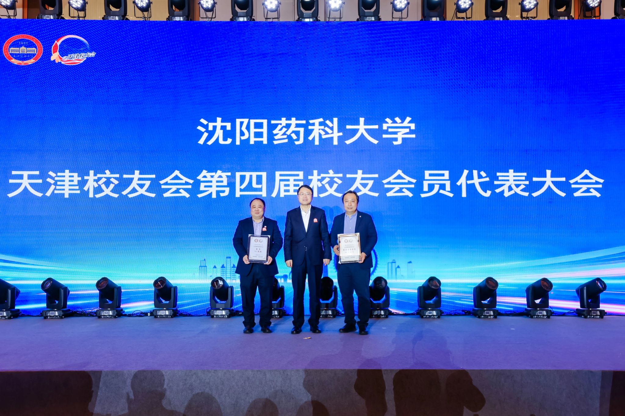 高明宇代表学校为沈载宽颁发天津校友会终身名誉会长证书,为周鸿颁发天津校友会会长聘任证书。